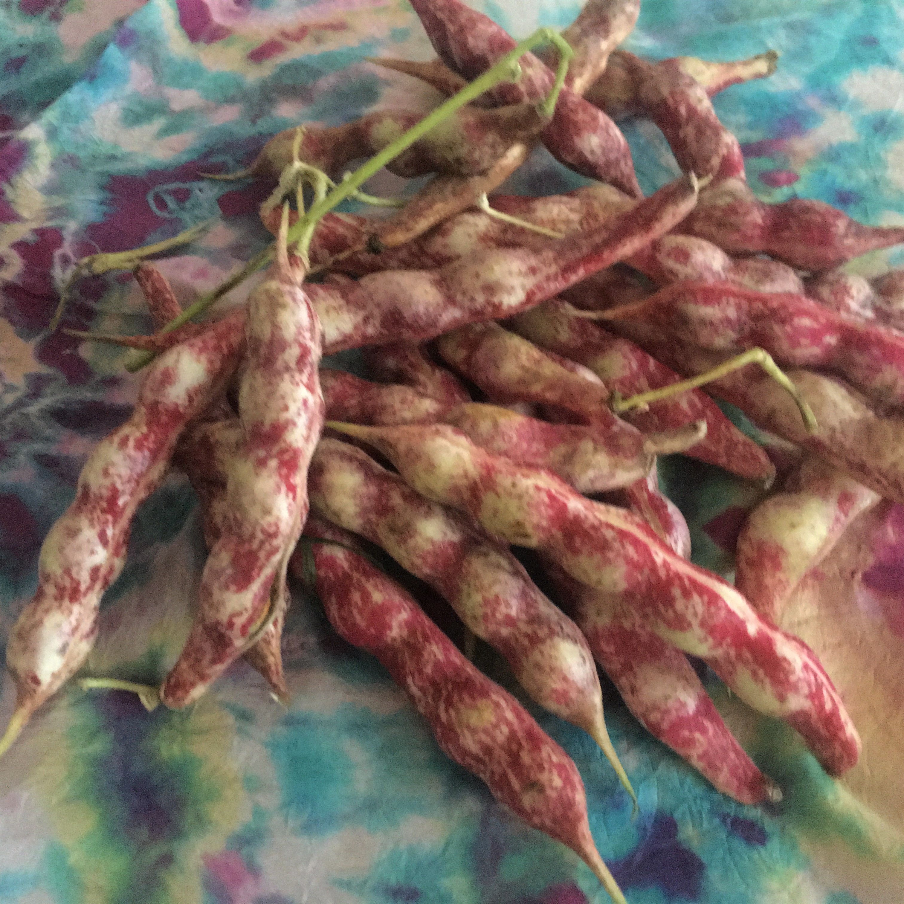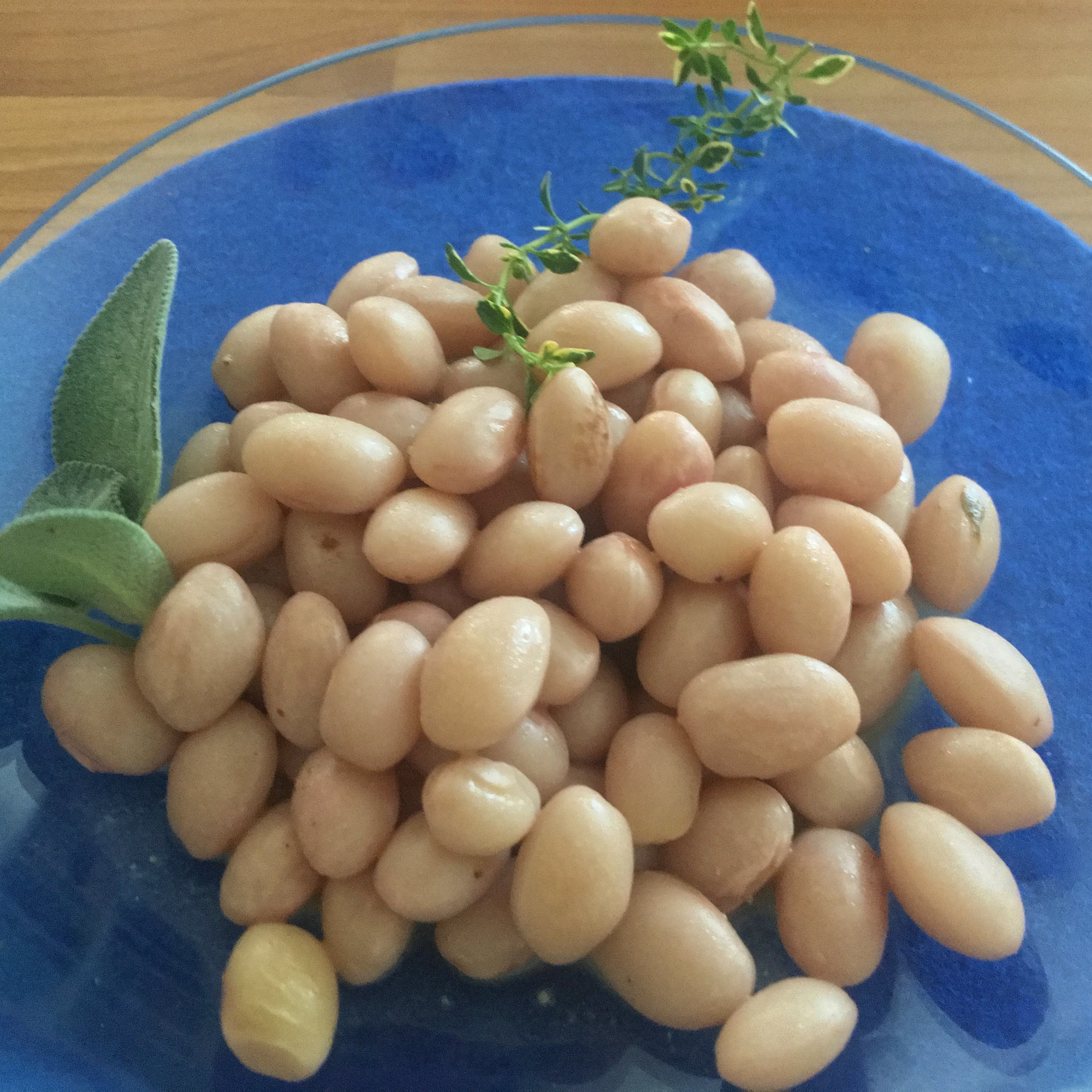 De borlotti bonen komen uit de moestuin waar ik groenten en fruit haal. Door de wit met roze spikkels worden ze in Amerika ook wel cranberrybonen genoemd. Evenals bij paarse groenten verliest de boon haar kleur bij het koken, maar is wel mooi crèmekleurig. De smaak is zoet en nootachtig, de borlotti heeft bite en is geliefd in de Italiaanse keuken.
