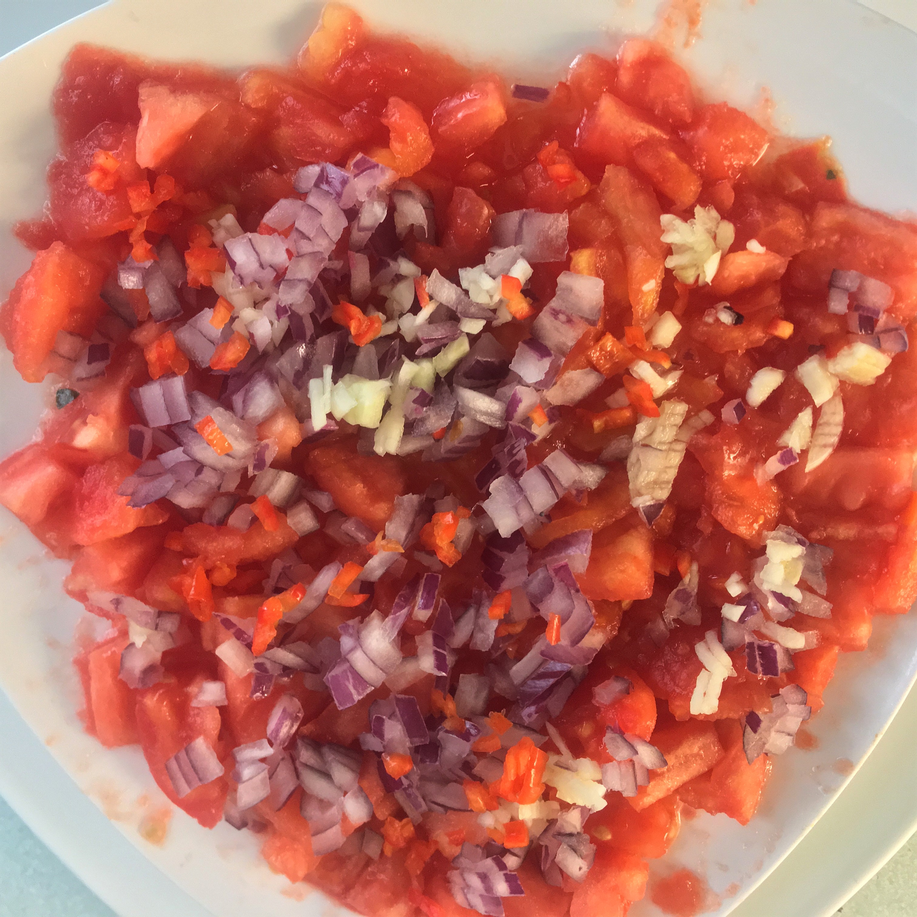 4 Roma Super Mama, vlezige tomaat, kop en voet ingekruist, 2 minuten geblancheerd in de bouillon, ontveld, gehalveerd, ontdaan van pitjes in stukjes