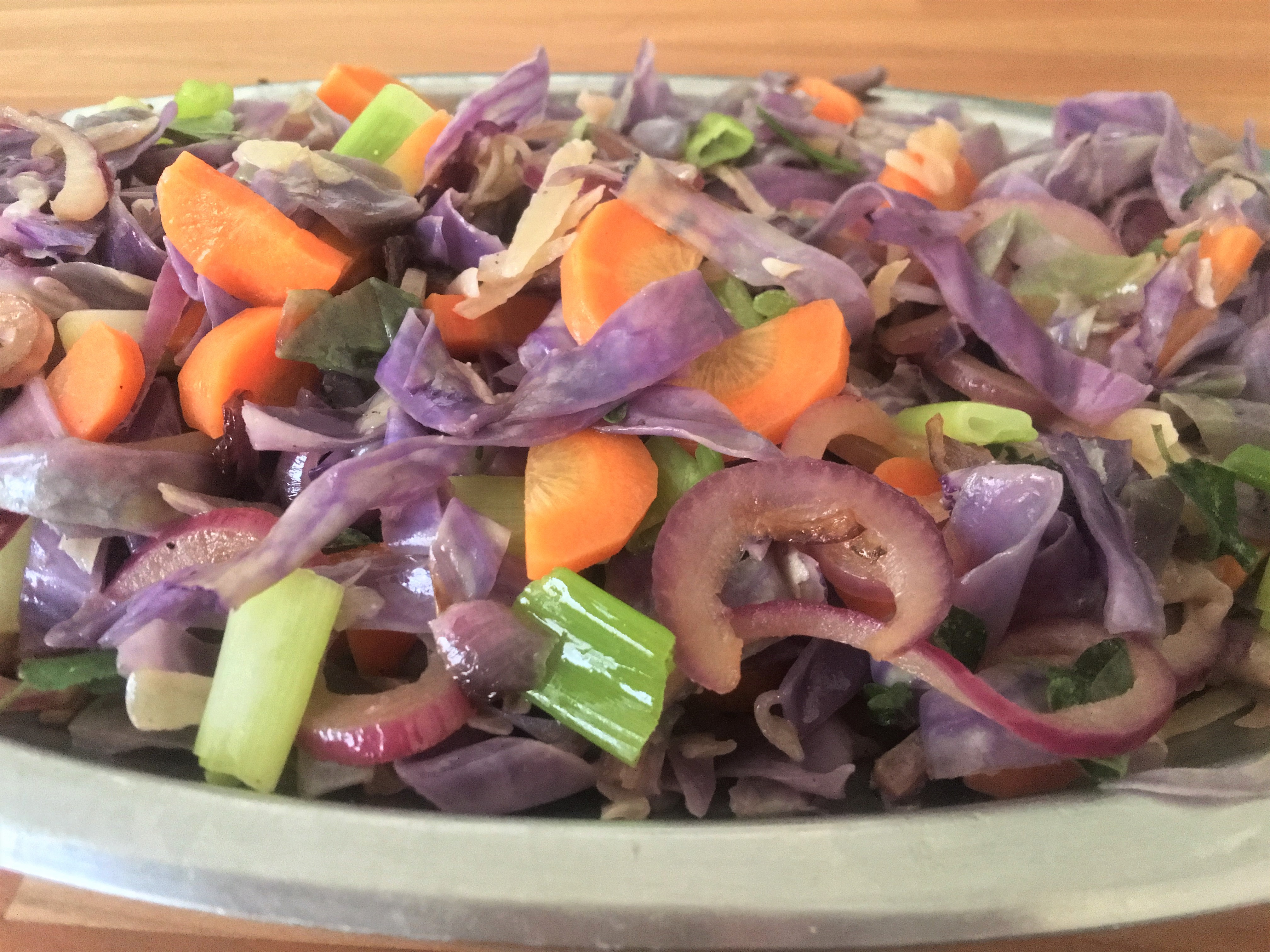 De paarse spitskool is kort gewokt en gehusseld met de kazen, verse oregano, geblancheerde wortel, bosui en gefruite rode ui met wat balsamico azijn.