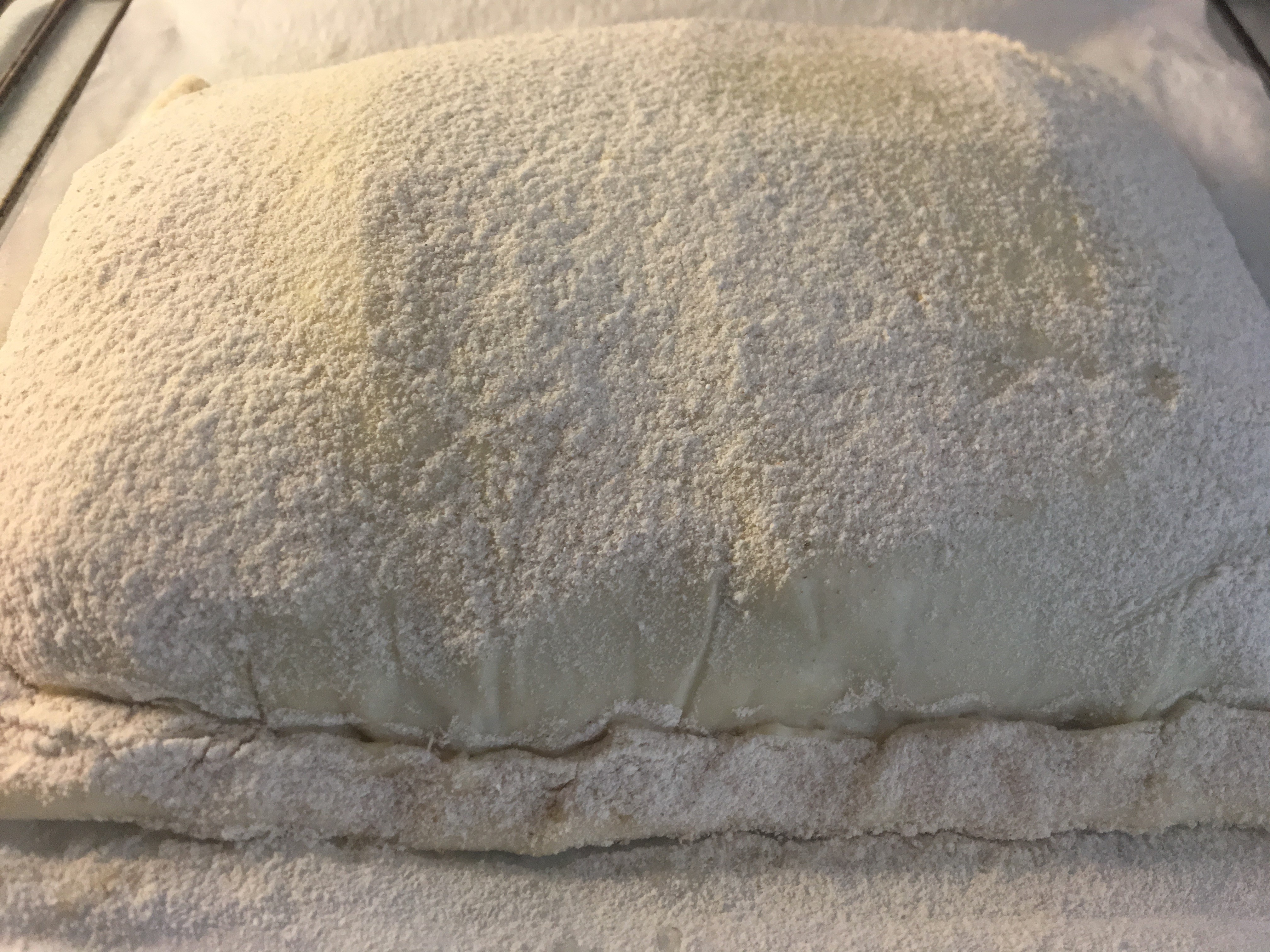 Maak de bovenkant en de naden wat vochtig met water en bestrooi die [door een zeefje] met wat meel. Veeg overtollig meel weg na het afbakken.