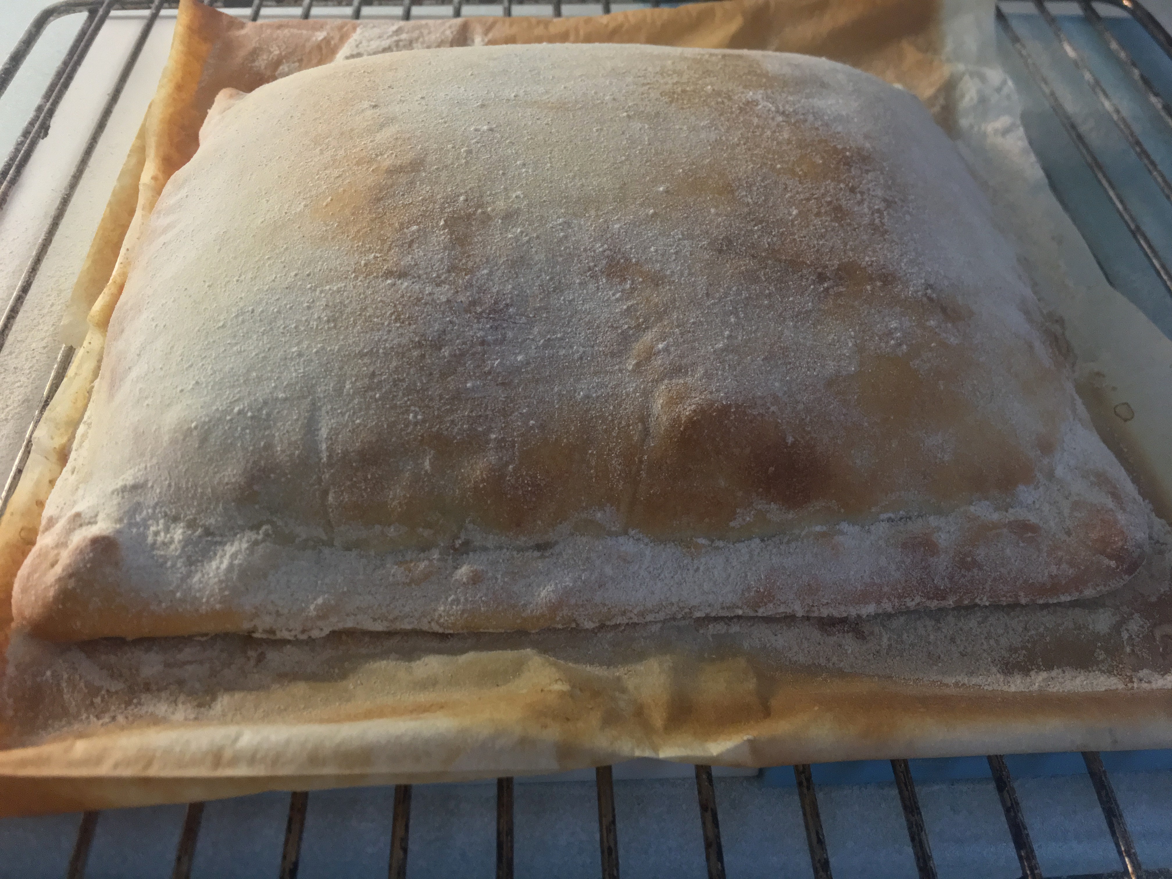 1 pak Tante Fanny flammkuchen deeg [iets dunner dan pizza, de calzone in 20 minuten op 180 graden in een hete lucht oven afbakken]
