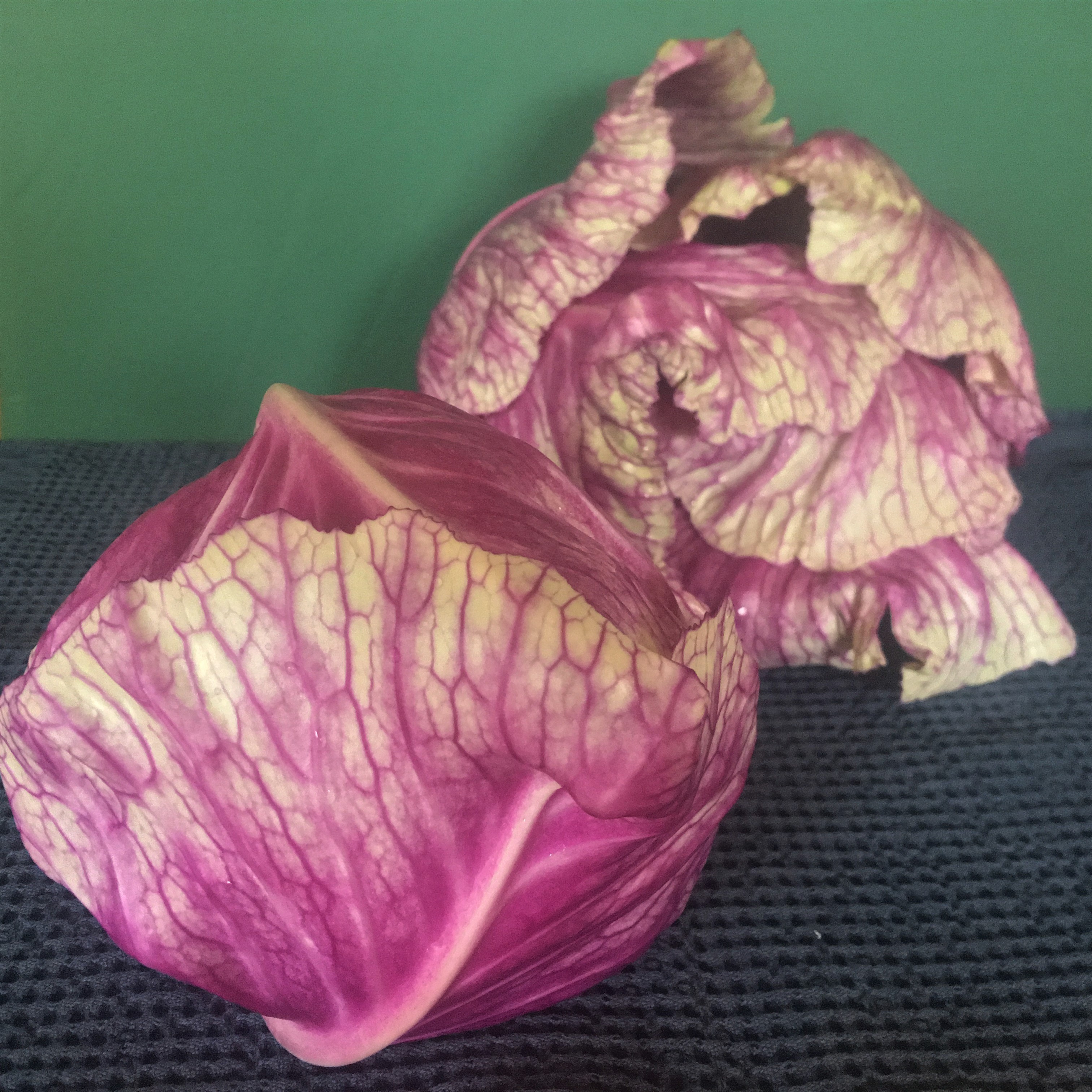 Bij de moestuin van landgoed Zuylestein haalde ik een prachtig paars met lichtgroen, knisperig spitskooltje. De geur doet bij het snijden aan koolrabi denken, fris en lichtzoet. Mijn kooltje had een grappig spitse punt, maar dat is afhankelijk van de hoeveelheid zonlicht tijdens het groeiproces.