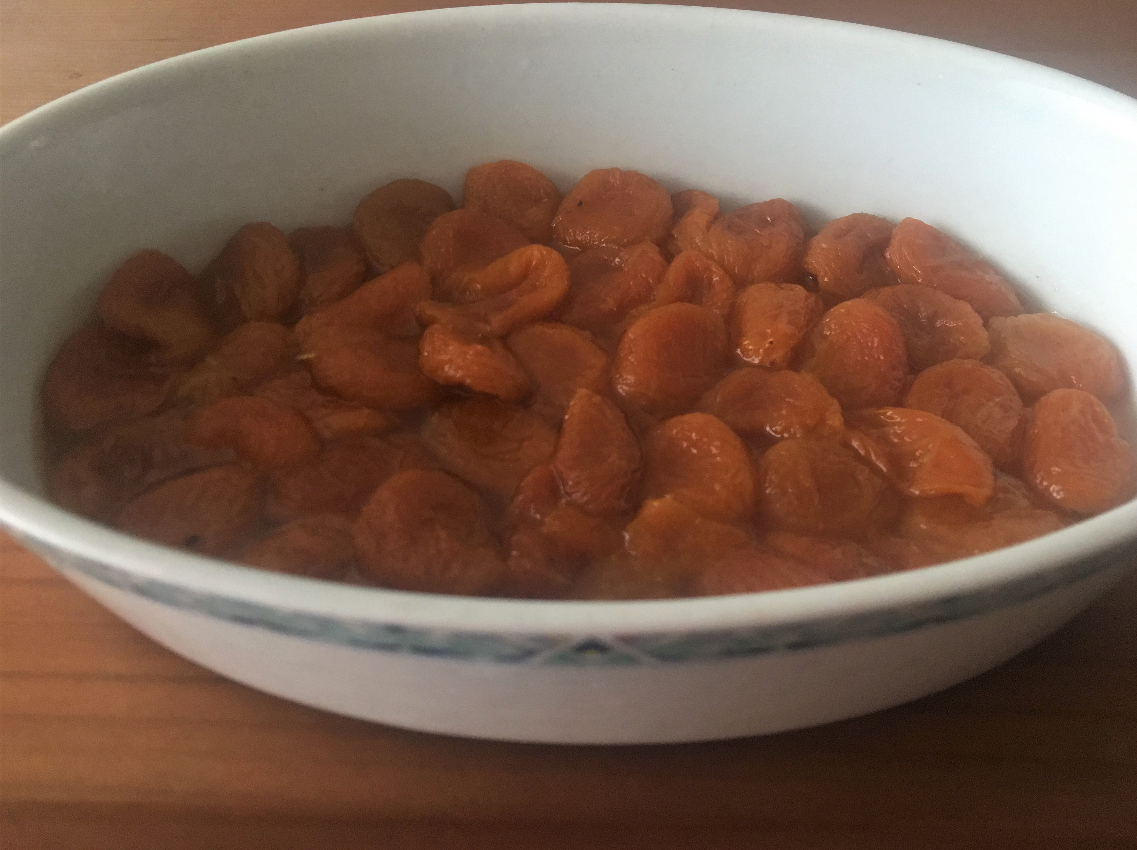 Verwarm het water maar niet tot aan het kookpunt en schenk het erover in de schaal. Schep ze luchtig om, schik de abrikozen weer op de bodem en zet ze na afkoelen 36 uur afgedekt, gekoeld weg om te wellen. Ook de smaak ontwikkelt zich dan.