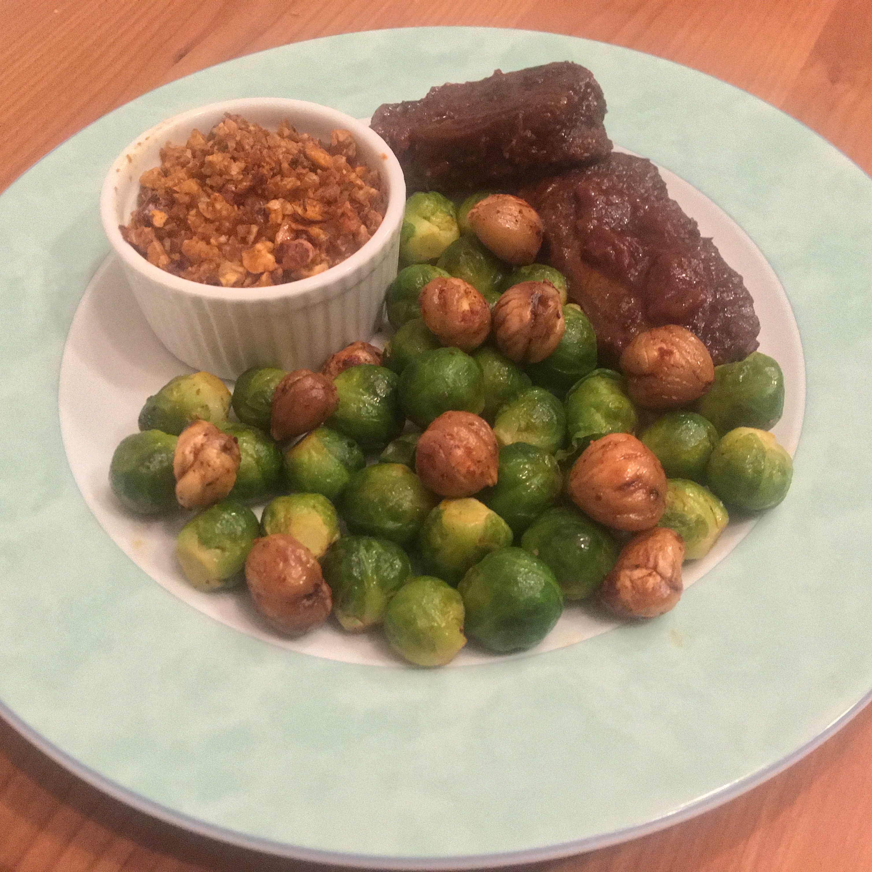 Verwarm de resterende rode olie met een ietsiepietsie kruidnagel en wok de hele noten tot ze een mooi kleurtje hebben, niet te lang of te hard, dan worden ze droog. Herhaal dit met de spruitjes en hussel er van de hittebron af flink wat citroentijm door. Serveer ze in een mooie schaal en strooi de hele kastanjes erover.