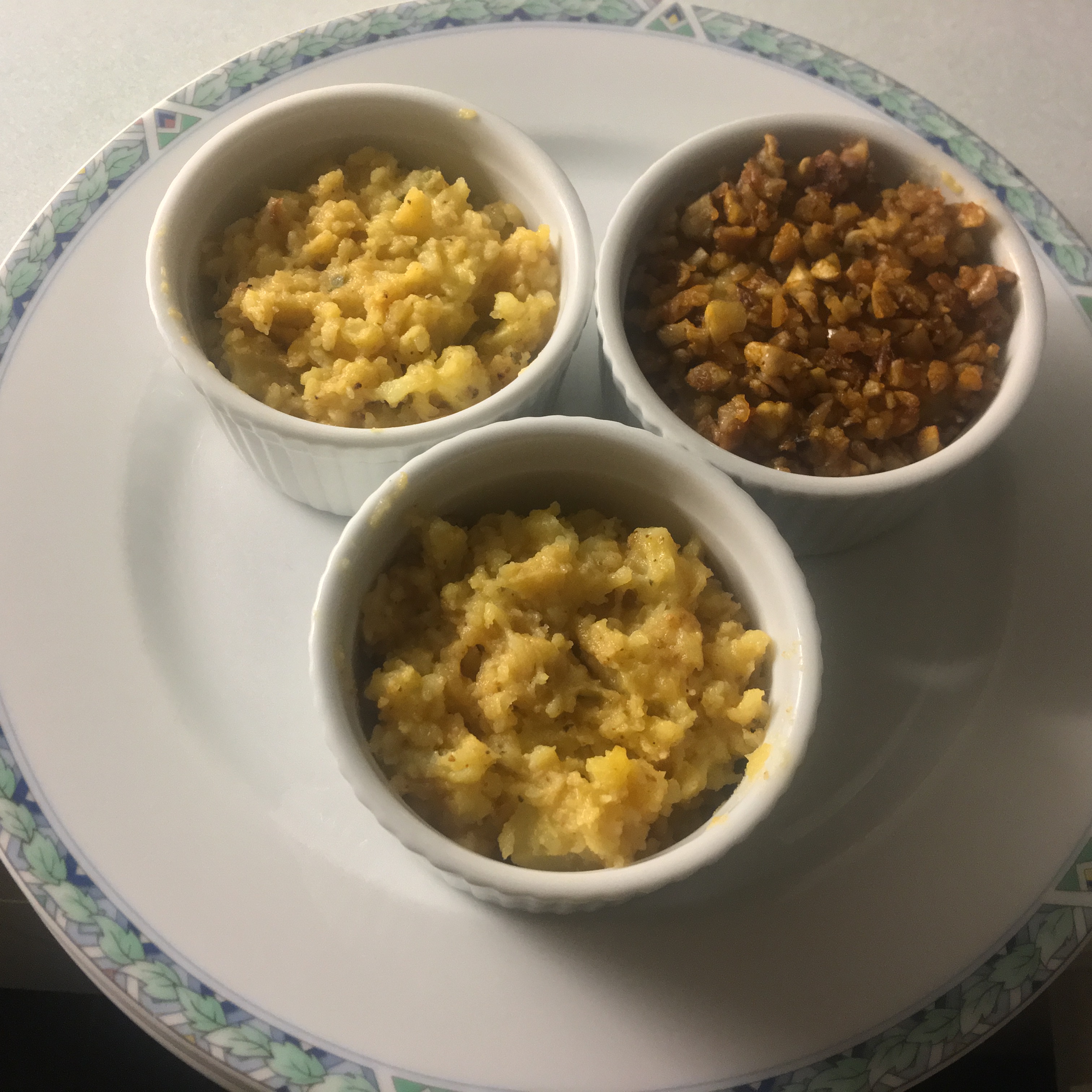 Ik nam een zakje mee, kerfde ze goed in en verwijderde de bast om ze daarna te splitsen in de allermooiste hele noten en de licht beschadigde voor crumble. Die crumble als topping op grove maar smeuïge aardappelpuree in kleine ovenschaaltjes, gemaakt van smakelijke biologische aardappeltjes. Het belang van een lekkere aardappel was het onderwerp van de eerste aflevering van de TV serie Joël Lokaal, die daarin op zoek is naar het Nederlandse terroir.