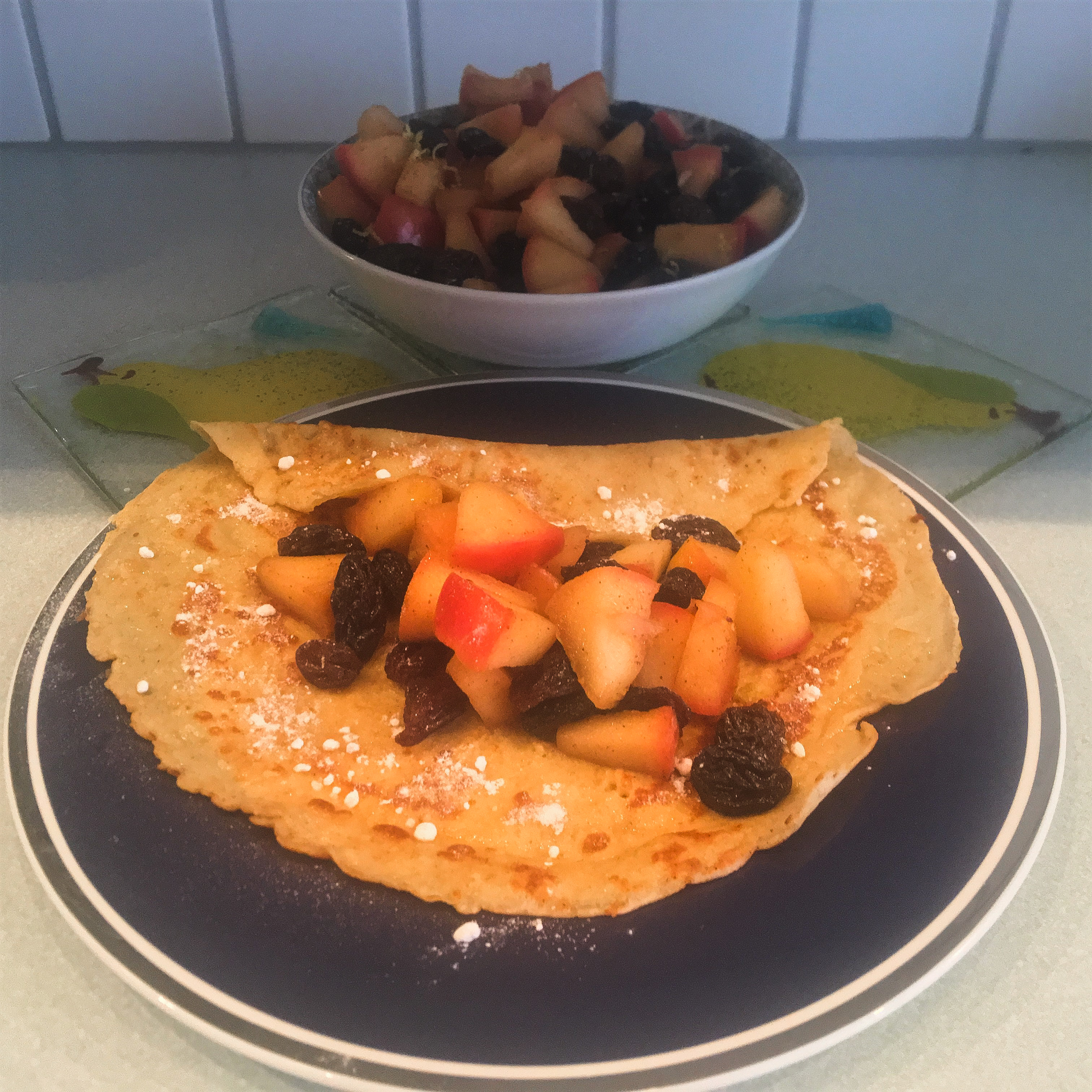 Verwarm je koekenpan op matige temperatuur [stand 7 van 12 op een inductiekookplaat]. Bak de pannenkoekjes in een klontje roomboter, Ik gebruikte 4 sauslepeltjes mix per fruit pannenkoekje. Schik het op een ontbijtbord. Verdeel de appel_rozijnen_compote in 4 porties en schik een kwart op elk pannenkoekje. Vouw de bovenrand van de pannenkoek deels terug en bestrooi heel licht met poedersuiker.