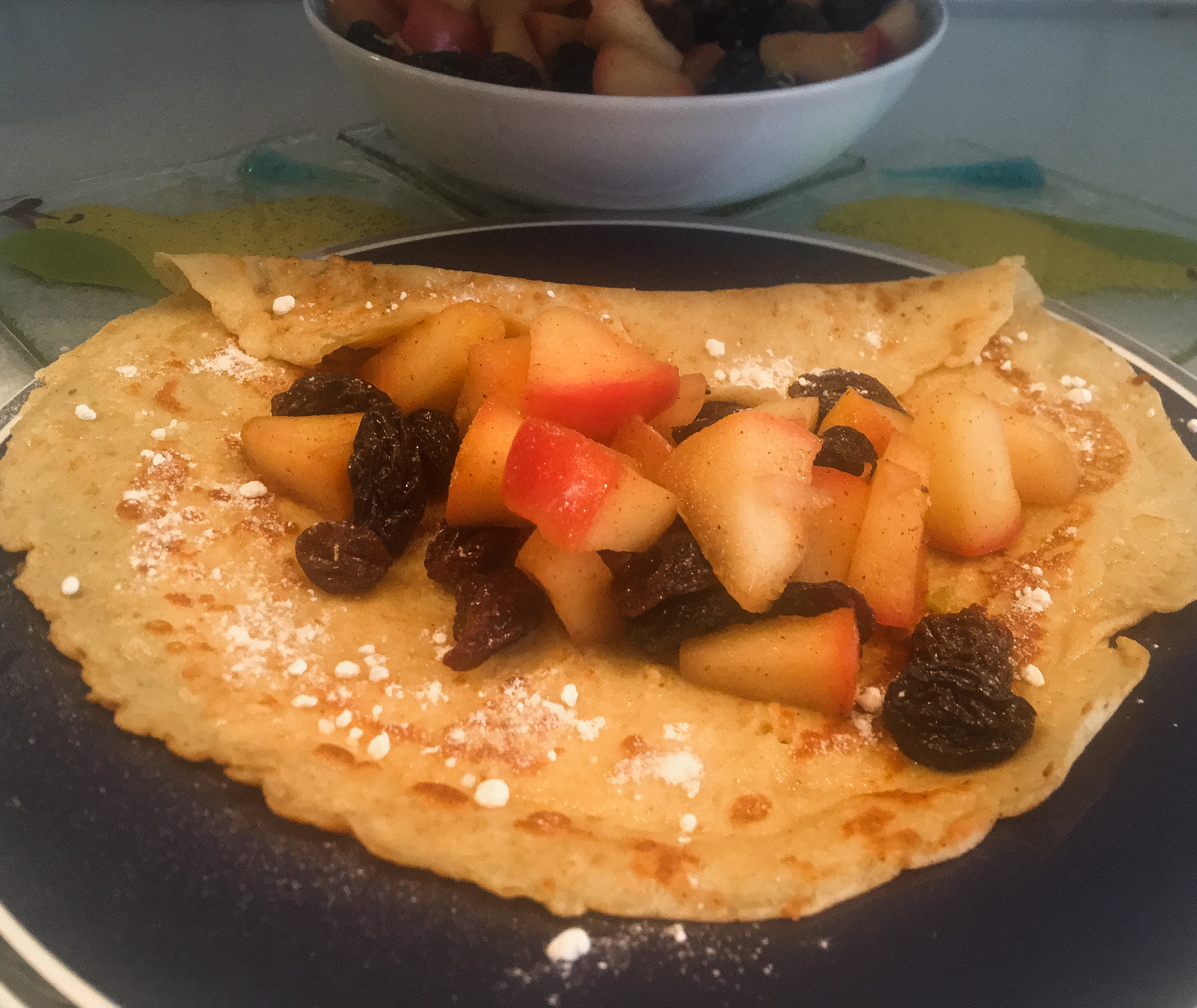 Fruitontbijt Anders: deze overheerlijke, simpel te maken pannenkoekjes zijn fris en licht zoet. Voor de appelcompote sneed ik blokjes Pink Lady met schil en wentelde ze door citroensap. Voor het wellen van de rozijnen verwarmde ik twee eetlepels water met gember-jenever drank en appelstroop. De appelblokjes zijn licht gefruit in roomboter, gehusseld met de rozijnen en gekruid met kaneel. Het vocht van de compote gaat in de 6-granen mix. Zo yummie!