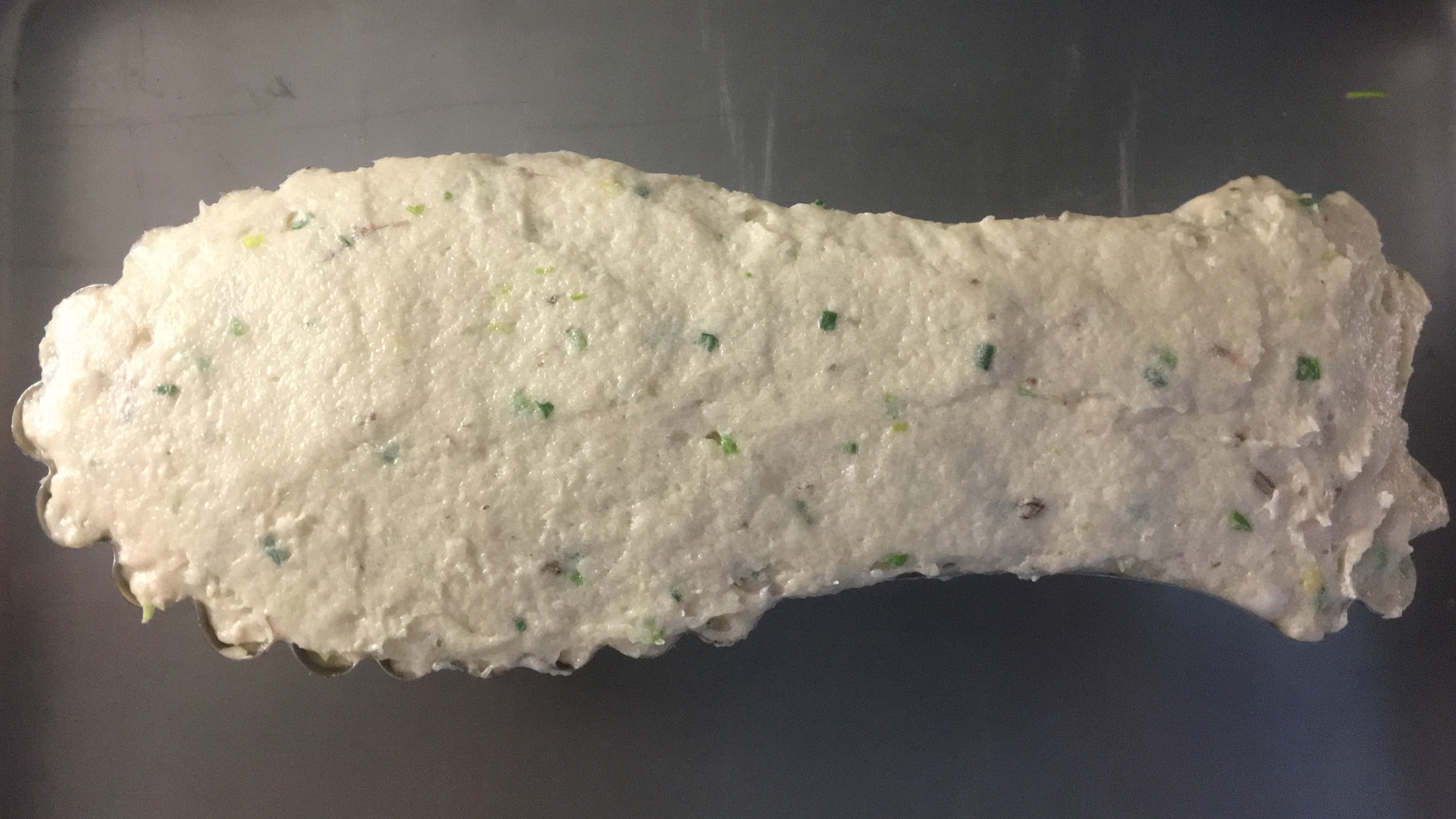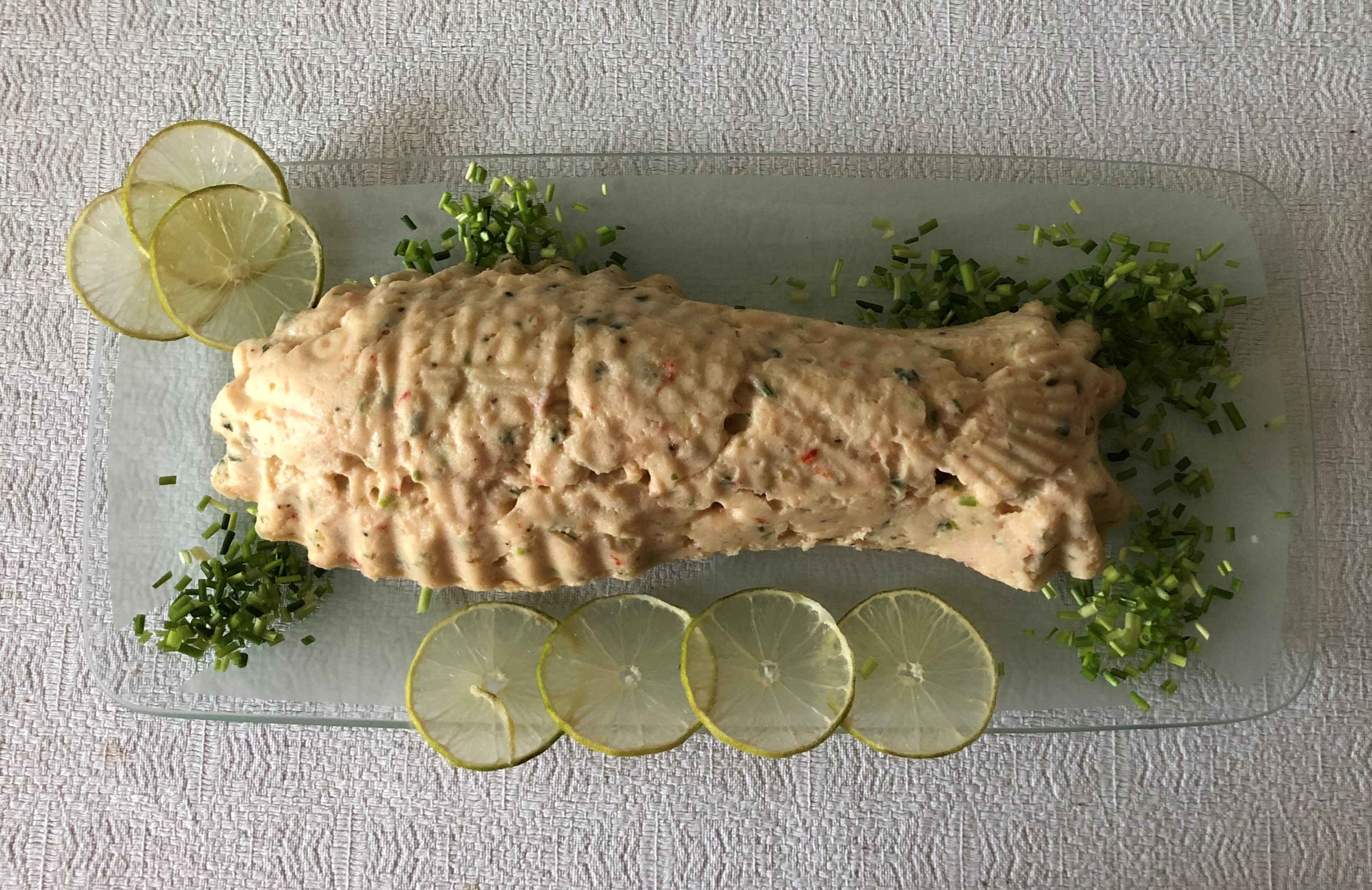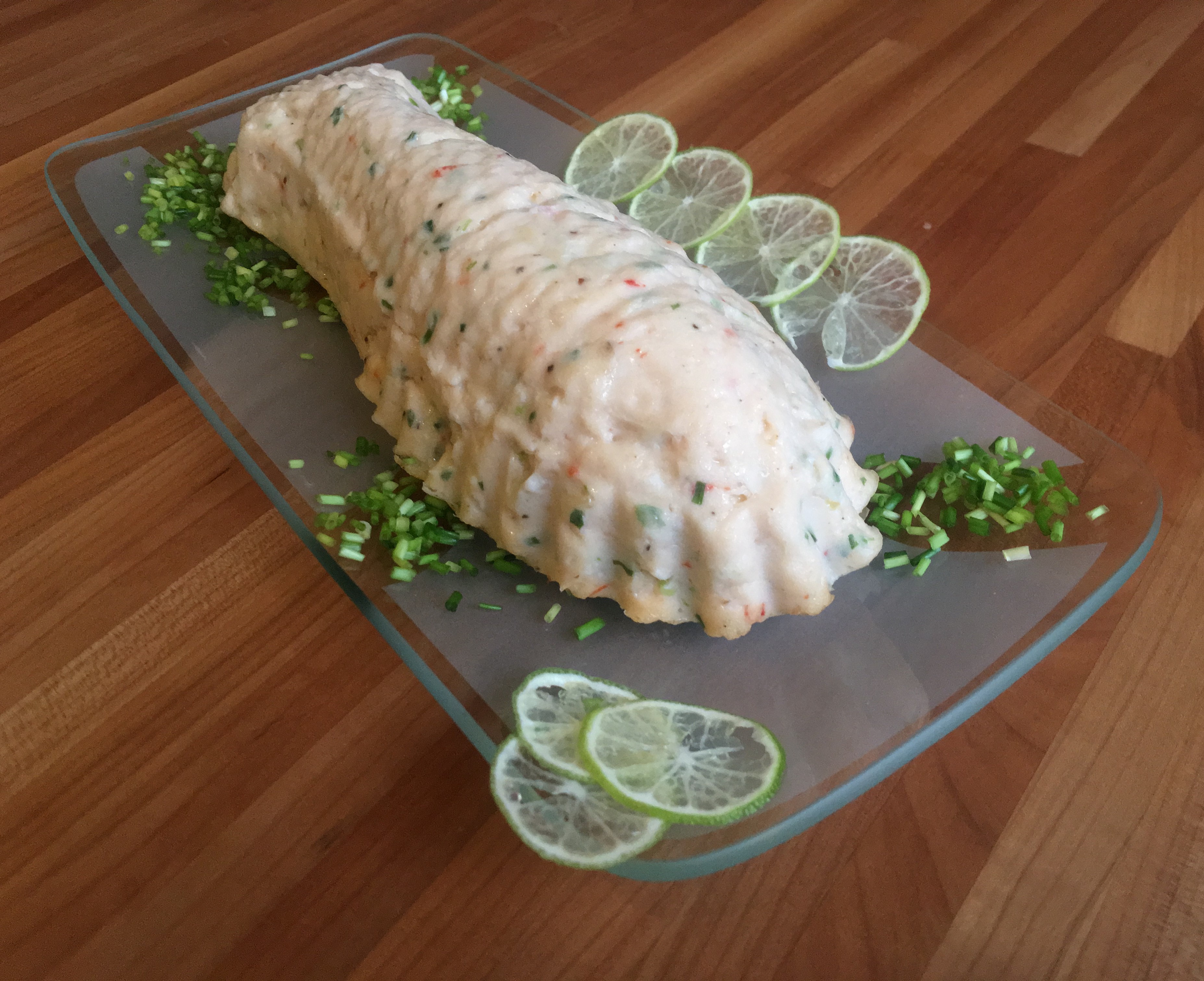 In de Franse keuken wordt zeker op feestdagen mousse geserveerd. Dit prachtige visje is gemaakt van kabeljauwhaas, tijgergarnalen en coquilles, clotted cream, witte wijn, pernod, visfond en bieslook. De mousse is heel romig, zacht en fijn, zowel van textuur als van smaak om de delicate smaken van de vissoorten tot hun recht te laten komen. Verder slechts gekruid met mooi zeezout en 4-seizoenenpeper en in een deels met water gevuld blik gebakken in de oven.