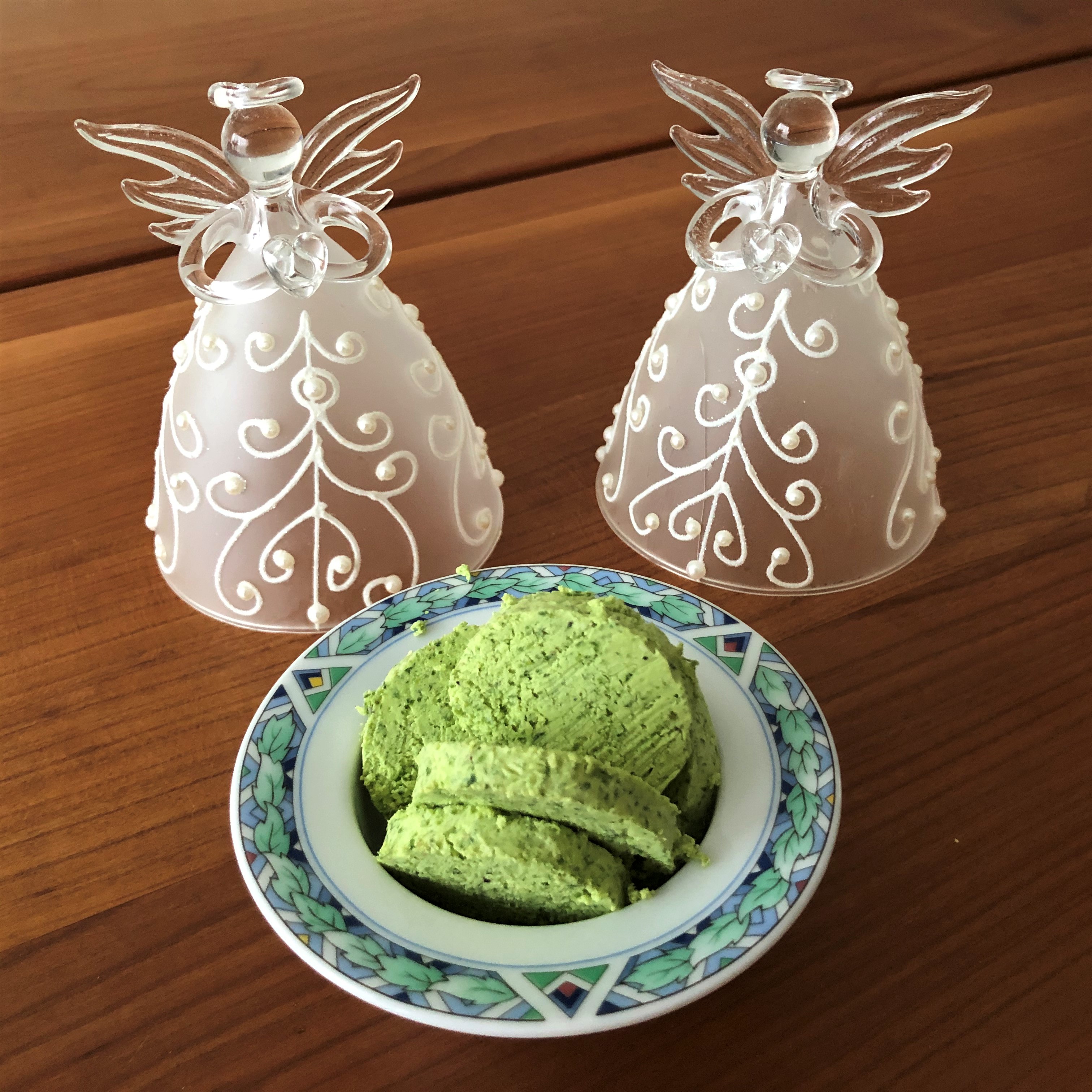 Doe alle ingrediënten in de blender en pulseer de inhoud eerst krachtig tot redelijk fijn. Zelf knipte ik de blaadjes grof boven de kom. Laat het dan zo’n 10 minuten rustig draaien tot je kleine groene spikkeltjes in een mooie vaste creme hebt. Die creme is nog licht vochtig, wel stevig en ook luchtig.