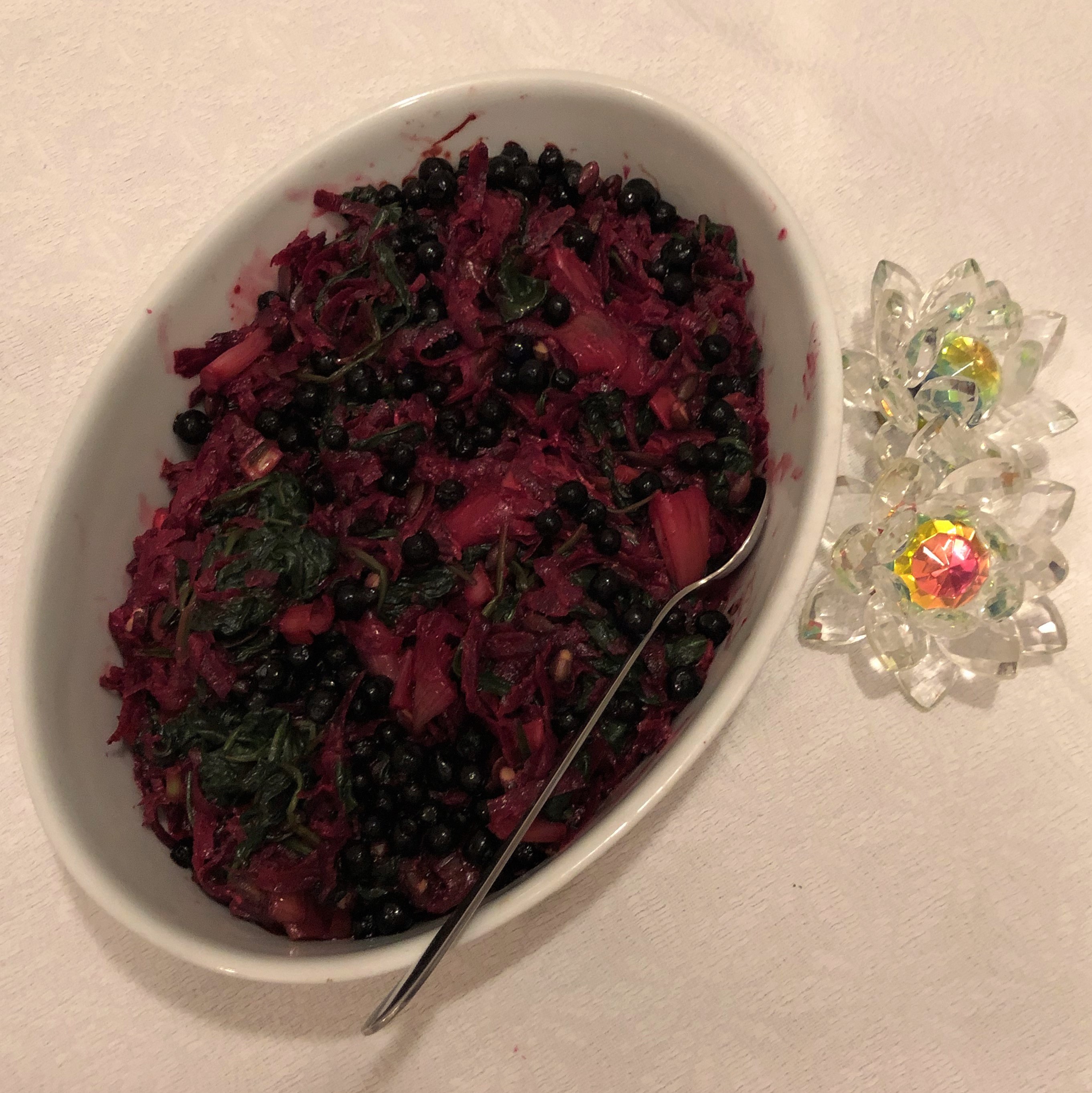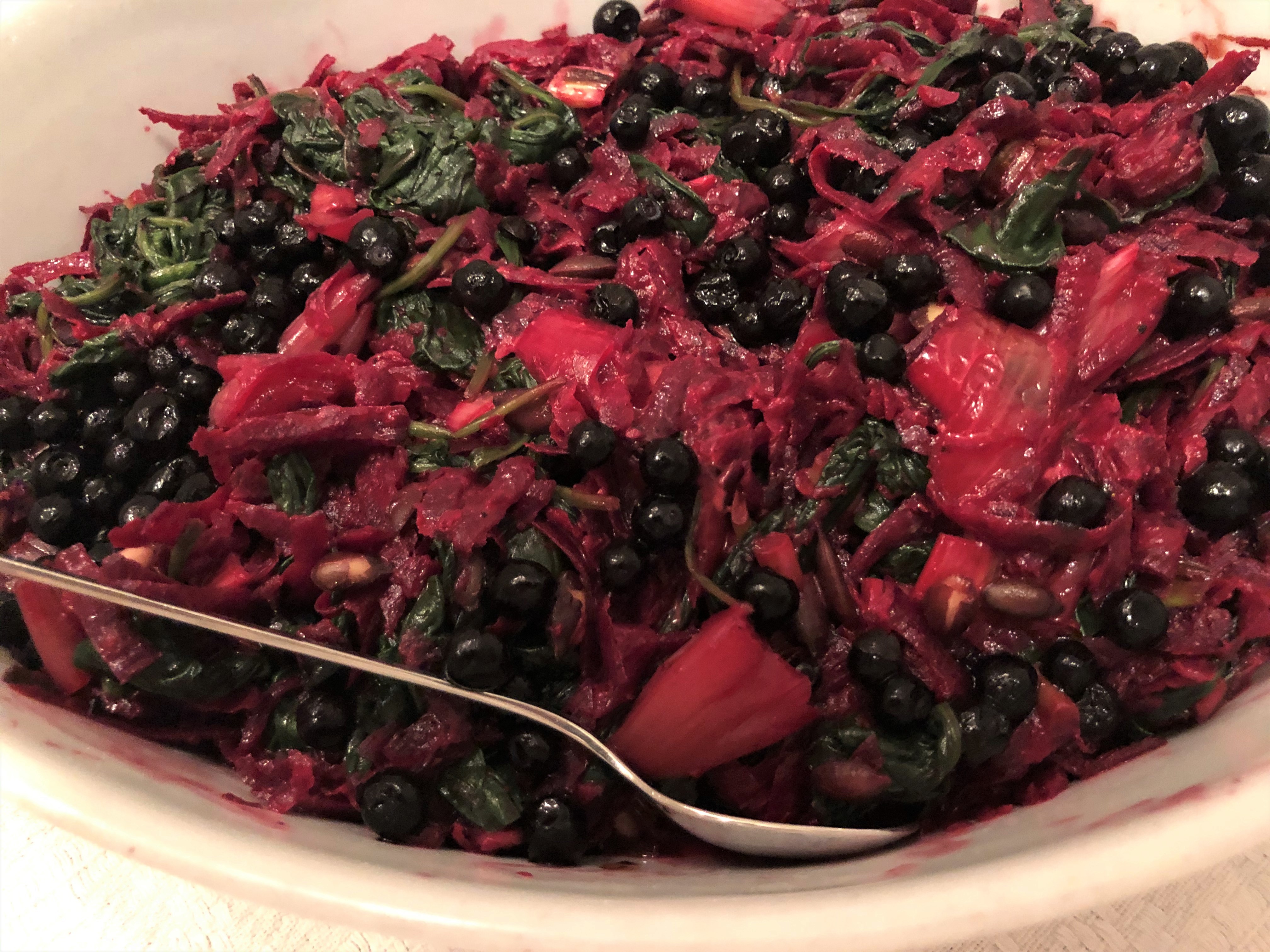 Een salade van rauwe rode bosbiet met jonge spinazie, verschillende uien, sjalotten en bosuitjes, frambozenazijn in de dressing en tot slot fruitig bestrooid met bosbessen. De sjalotten zijn met balsamico in folie gegaard in de oven en grof gesneden.