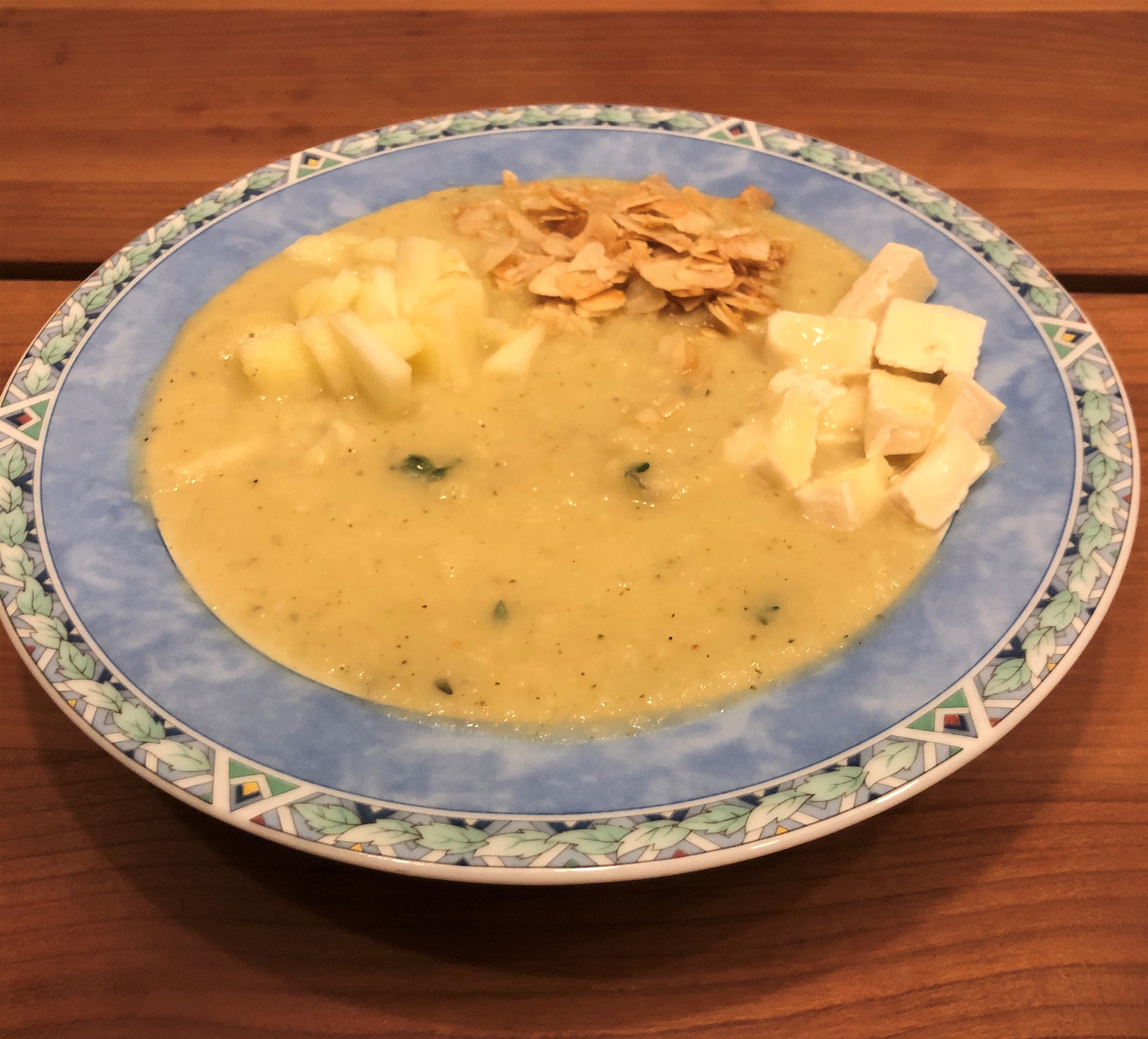 Een lenteachtige volle groentesoep van jonge pastinaken met frisse Granny Smith appels, bereid met GranFruttato olijfolie, rode sjalotjes, verse knoflook, blaadjes verse tijm en laurier. Als garnering krokant gebakken amandelschaafsel, flinterdunne appelstukjes en een halfharde geitenkaas, de Perail. Als aanvulling op de frisheid met een flinke vleug limoensap.