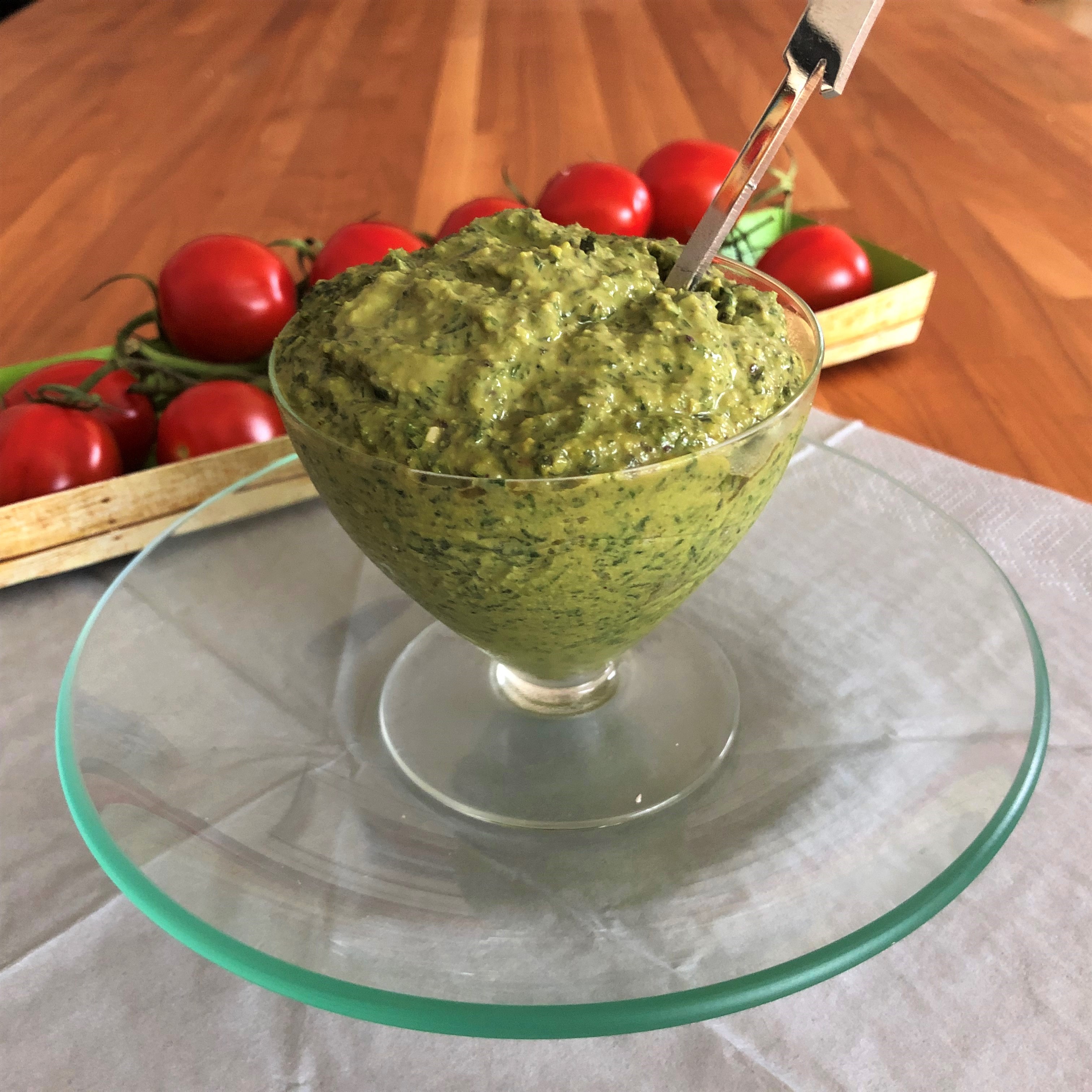Groene kruiden groeien in de zomer als kool en deze dagen krijgt de kruidentuin van mijn dochter een grote snoeibeurt. Haar dragon barstte uit zijn voegen zeg maar en zoveel snoei ineens is natuurlijk jammer van de oogst. Met pesto di pistacchio, Liguritio extra vergine olijfolie, krulpeterselie, verse knoflook en roomboter toverde ik deze heerlijke pesto op tafel. Lekker bij geroosterde kerstomaatjes, gefruite sjalot ringen, op een pizza, door je risotto of in de pasta.
