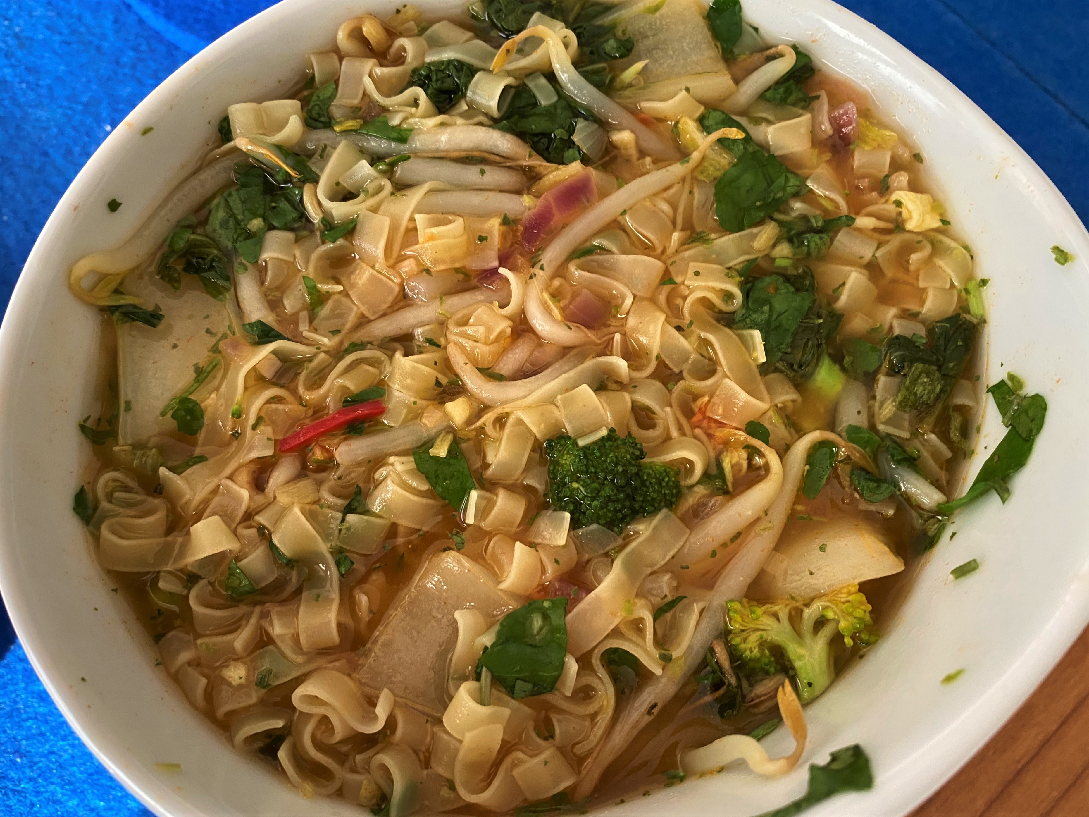 Asian Style noedel soep, bomvol met groenten zoals mini paksoi, mini broccoli roosjes, taugé, grof geknipte waterkers, mini rode uitjes, rode peper, geraspte gember en homemade tomatenbouillon. Lekker vers met knapperige groenten in een grote kom.