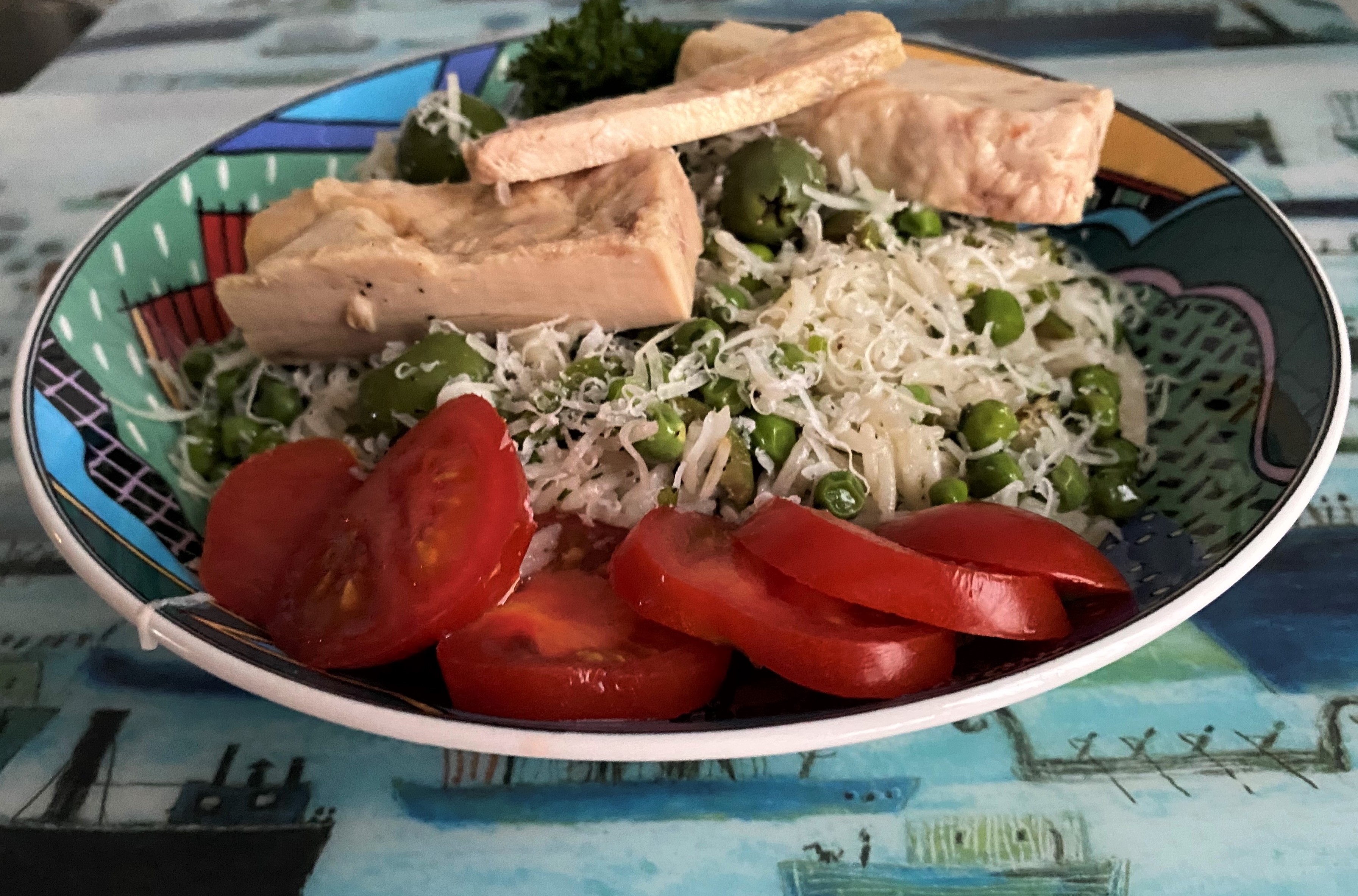 Rasp de Pecorino Nero zonder velletje zo koud uit de koelkast erover heen, hussel om, rasp er nog iets overheen, schep enkele achtergehouden doperwten on top en decoreer je schotel met de hele tonijn filets, de Tasty Tom tomaatjes en plukjes peterselie.